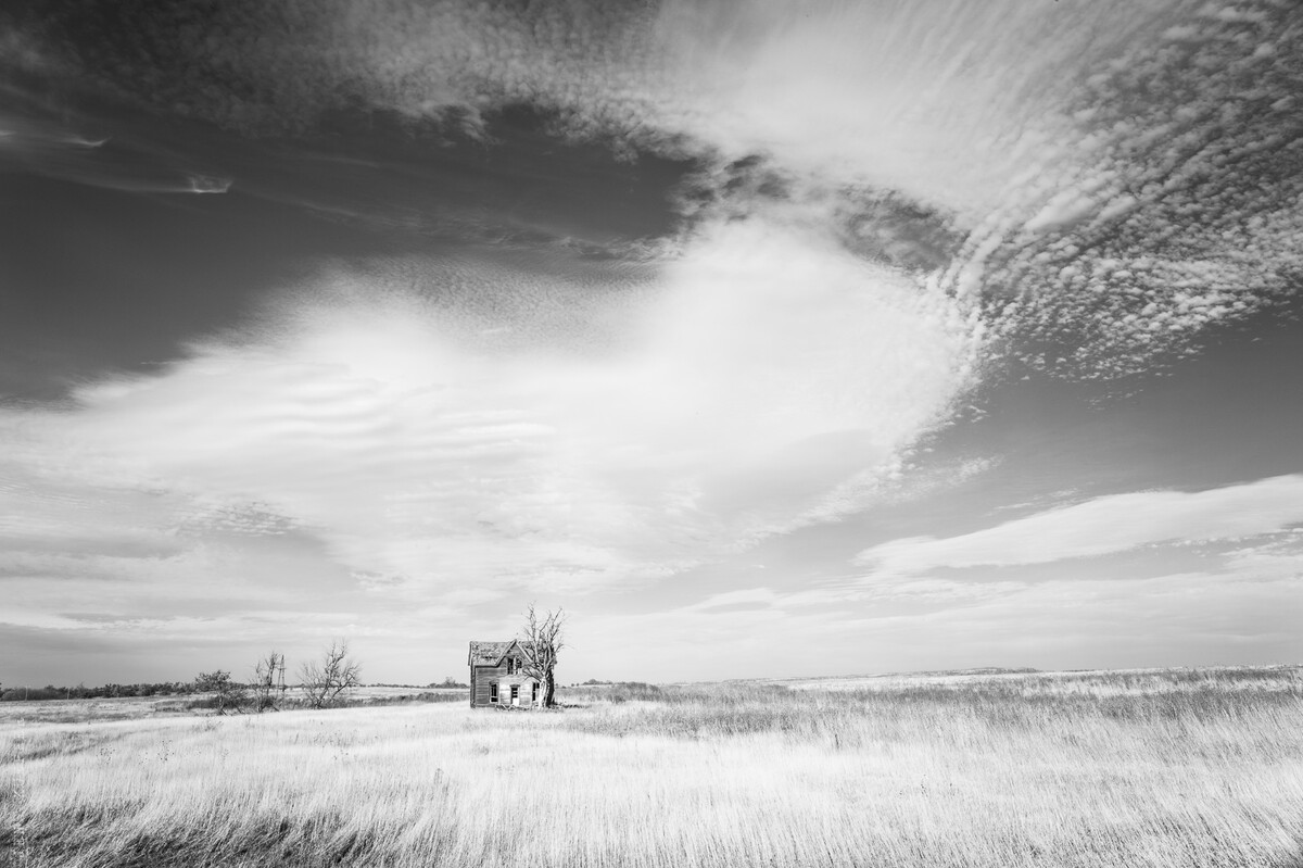 Die Aufnahme machte ich im November 2013 während einer Tour durch die Vereinigten Staaten. Wir kamen aus den Bergen der Rocky Mountains über Denver hinab ins Flachland von Kansas. Schnurgerade Straßen, der Highway 70, und ganz selten am Rande auf weitem Feld ein Haus. An einer Stelle stach das helle Gras besonders vom Himmel ab, so dass die Zeit für einen Stopp gekommen war. An diesem Haus verbrachten wir sicherlich eine Stunde, umrundeten es, erkundeten es. Weit und breit kein anderes Gebäude, nur dieses eine alleinstehende Holzhaus. Man fragt sich dann jedes Mal, warum ausgerechnet hier jemand gebaut, und schlussendlich diesen Ort dann wieder verlassen hat.