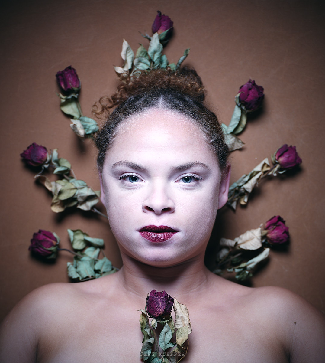 Long story short: Es ging gut – wir trafen uns gegen Mittag und verabschiedeten uns spätabends. Und hatten in der Zwischenzeit viele Ideen, viele Motive, viel Spaß. Im kleinen Rückblick ist interessant zu sehen, welch unterschiedliche Varianten hier durch zwei Amateure entstehen können. Was hatten wir zur Verfügung? Da war Herbstlaub, welches ich tags zuvor bei uns vorm Haus aufgelesen und getrocknet hatte. Beim Pilze sammeln in der letzten Woche gingen drei große Sonnenblumen mit in den Korb und standen noch ganz gut da. Komplett trocken hingegen waren ein kleiner Strauß dunkelrote Rosen. Eine Staffelei und ein Spiegel standen uns auch zur Seite. Dazu natürlich ein 'bisschen' Lichttechnik und drei Kameras. Eine davon nicht digital. Bei deren Gebrauch zeigte sich sehr deutlich, wie wenig ich eben nicht in Übung war. Da waren gleich mal sieben von zehn Aufnahmen des Rollfilms für den Müll: Falsche Belichtungszeit eingestellt, Blitz nicht sauber synchronisiert und und und. Da brauche ich den Film nicht mal entwickeln, um zu wissen, dass das in die Hose ging. Aber egal, denn die Session war ja als Übungssache gedacht.
